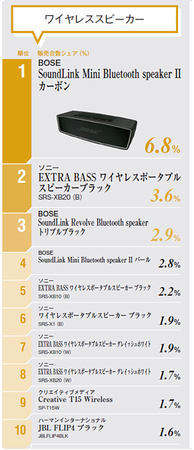 2017年6月のピックアップカテゴリは、「SIMフリースマートフォン」「ノートPC」「4Kテレビ」「ワイヤレススピーカー」「モバイルバッテリ」「ドライブレコーダー」の6つ。「ワイヤレススピーカー」の1位はシェア6.8%で、BOSEの「SoundLink Mini Bluetooth speaker II」のカーボンでした。ワイヤレススピーカー
