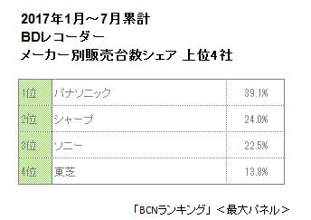 家電量販店・オンラインショップの実売データを集計する「BCNランキング」によると、2017年1月~7月の累計で、BD・BD/HDD搭載レコーダー(レコーダー)のメーカー別販売台数1位はパナソニック。2位以降はシャープ、ソニー、東芝の順で、上位4社で9割以上を占めた。