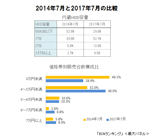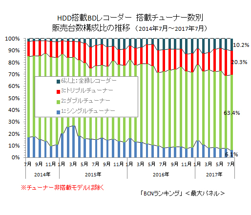 搭載するHDDの容量は、3年前の14年7月は「500GB」が主力だったが、今年7月は「1TB」へとシフト。「1TB」「500GB」に続き、かつては高額だった「2TB」も価格がこなれ、HDD搭載機種の13.8%を占めた。長年、エントリ向けモデルとして売れ続けていた「500GBのシングルチューナーモデル」に代わり、2番組、3番組を同時に録画できるダブルチューナー/トリプルチューナーモデルがあわせて約8割を占め、人気を集めている。