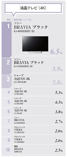 2017年7月のピックアップカテゴリは、「スマートフォン」「キーボード」「デジタルビデオカメラ」「SIMフリースマートフォン」「ノートPC」「4Kテレビ」の6つ。「4Kテレビ」の1位は、ソニーの4K液晶テレビ「BRAVIA 8300Dシリーズ」の49型「KJ-49X8300D(B)」でした。2位にも43型「KJ-43X8300D(B)」がランクイン。OSにAndroid TVを搭載し、テレビ放送と動画配信サービスをシームレスに視聴できます。