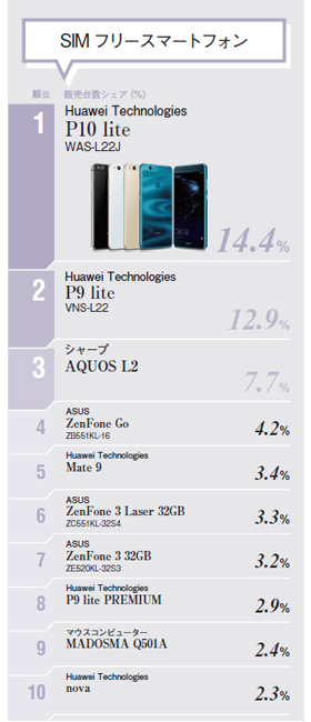 2017年7月のピックアップカテゴリは、「スマートフォン」「キーボード」「デジタルビデオカメラ」「SIMフリースマートフォン」「ノートPC」「4Kテレビ」の6つ。「SIMフリースマートフォン」は、6月に続き、「HUAWEI P10 lite」と「HUAWEI P9 lite」がワンツーフィニッシュを飾り、メーカー別でもファーウェイはトップを独走しています。