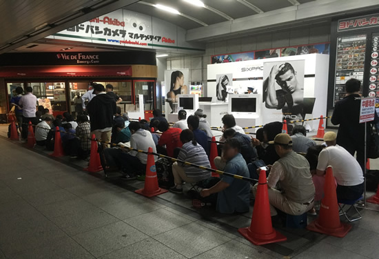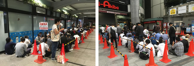 予約は朝9時からだったが、受付開始前に予約可能人数を上回る人が押し寄せ、予約待ちの行列は、JR秋葉原駅の昭和通り口改札側にある店舗入り口から始まり、中央改札側の入り口前、北側の入り口前と、ヨドバシAkibaを半周以上囲み、最終的には店舗に沿って昭和通りまで伸びた。