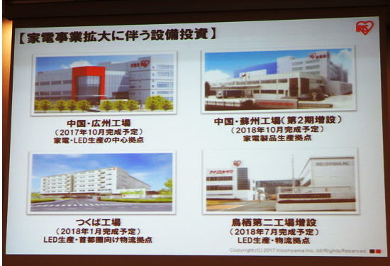 アイリスオーヤマは9月21日、現在稼働している中国の大連工場のほか、新たに広州工場の新設と蘇州工場の増設計画を発表。2018年10月に中国の3拠点体制を完成させて、17年12月期に単体売上高の約半分に迫る家電事業をさらに強化する。