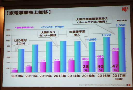 17年12月期のグループ全体の売上高は4300億円を計画しており、国内のアイリスオーヤマ単体では1550億円を掲げる。国内のうち、47%の730億円がLEDを含む家電事業となっており、9月末の第3四半期が終わる時点で、「730億円をほぼ達成できる見込みで推移している」(石垣統括事業部長)と、家電事業が予定通りに拡大していることをアピールした。カテゴリ別では、同日、新製品を発表したIHジャー炊飯器が、LEDに次ぐ中核事業になっている。(BCN・細田 立圭志)