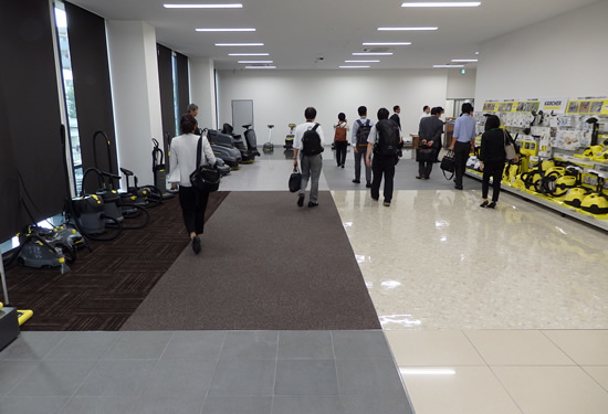 新社屋は4階建てで、1階はショールーム、2階から上は「ケルヒャーアカデミー」として、代理店や社員トレーニングの場を用意。大理石や御影石タイル、カーペットなど異なる床材による洗浄テストや、一般家庭を想定した洗浄スペースも用意するなど、研修センターとしての役割も担う。