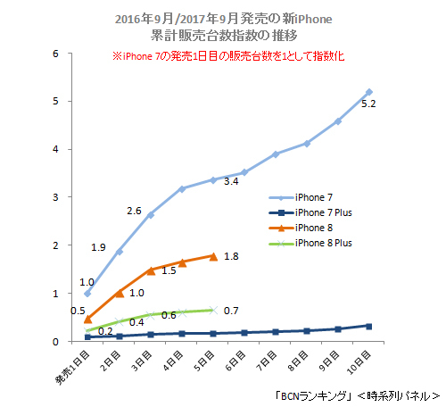 新モデル発売直後の初速は、今年が最も鈍い。16年9月発売の「iPhone 7/7 Plus」と、今回の新iPhone2機種「iPhone 8/8 Plus」の日ごとの累計販売台数指数を比較すると、発売1日目は前年の6割にとどまり、土日で若干取り戻したものの、5日目の時点では前年の7割の水準だ。