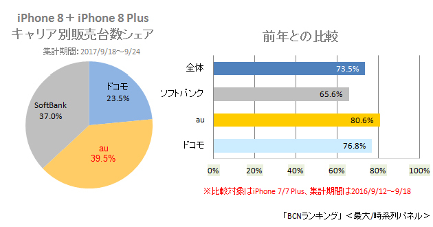また、「iPhone 8/8 Plus」に限ったキャリア別販売台数シェアは、ドコモ23.5%、au39.5%、ソフトバンク37.0%。昨年の「iPhone 7/7 Plus」までは、発売1週目は毎年、ソフトバンクがトップだったが、今年はauが1位を制した。それでも、販売台数は、前年の80.6%にとどまっている。