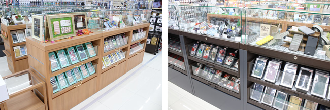 ビックカメラ初導入の木目調で背の低いスマホケースの商品棚。左が女性向けの棚で、右が男性向けの棚