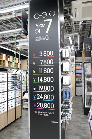 メガネ売り場では、ビックカメラ初の取り組みを実施。今までブランドやレンズ別に細かく分かれていたメガネを、価格帯で7つに振り分けた。以前よりも高くなった商品はなく、レンズ代も表示価格に含まれている。申し込みから受け渡しまでは、40分程度で対応する。