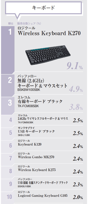 2017年7月のピックアップカテゴリは、「スマートフォン」「キーボード」「デジタルビデオカメラ」「SIMフリースマートフォン」「ノートPC」「4Kテレビ」の6つ。「キーボード」は、ロジクールの耐水・静音設計のフルサイズワイヤレスキーボード「Wireless Keyboard K270」がシェア9.1%を占め、トップでした。キーボード