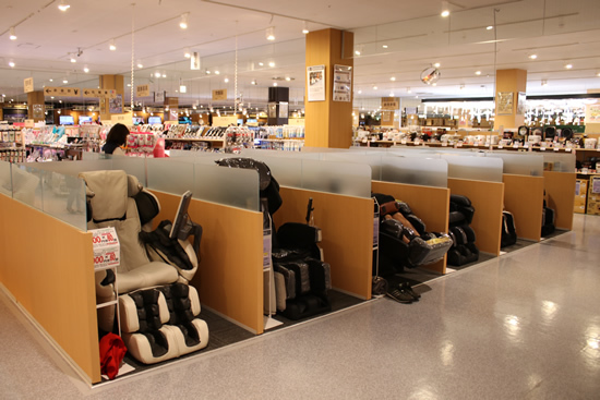 2階は商品棚が低く、冷蔵庫やエアコンなどの大型家電も壁面に寄せているため、見通しのいい売り場になっている。テレビ売り場にはソファを設置しており、両商品を同時に提案できるよう工夫している。マッサージチェアコーナーは一台ずつパーテーションで区切っており、落ち着いて商品の使い心地を試せる。