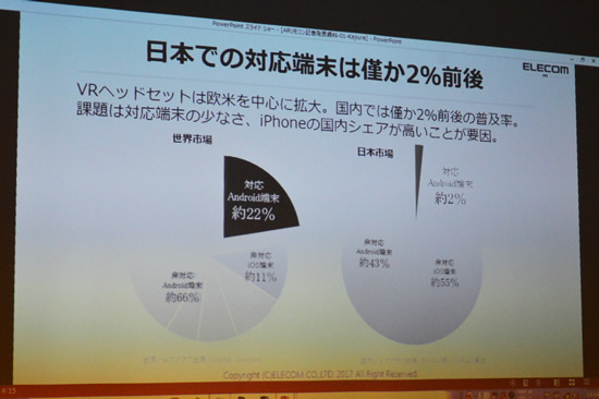 しかし、エレコムの梶浦幸二 常務取締役は、この足かせがチャンスになるとみている。iOS向けのAR/VR市場は開拓されておらず、パイオニアとなれば世界市場に打って出ることも可能だからだ。17年2月時点で、iPhoneユーザーは日本で0.5億人、米国で1.2億人、中国で2.7億人と推測されている。