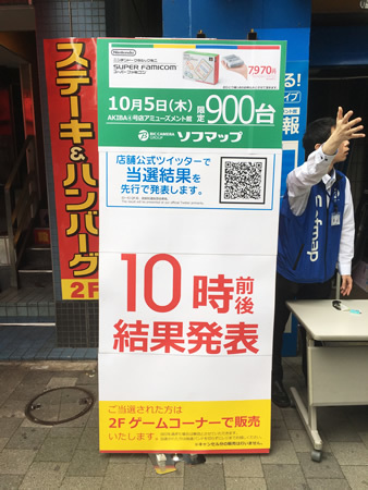東京・秋葉原にある「ソフマップ AKIBA4号店 アミューズメント館」では、900台のミニスーファミを用意し、朝8時から8時半まで、抽選への参加を受け付けた。参加したのは300人に満たない程度で、10時の当選者発表では、全員が当選したと発表。「ビックカメラ AKIBA」「ビックカメラ 池袋本店」などでも、販売状況は同様だったという。