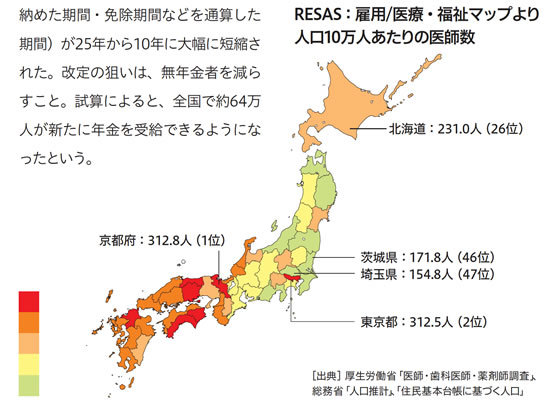 「RESAS」の「雇用/医療・福祉マップ」では、自治体ごとに、医療・介護に関するさまざまな指標を確認できる。例えば、14年の人口10万人あたりの医師数は、塗り分けマップで見ると、おおむね「西高東低」の傾向にあり、ワースト3は埼玉県、茨城県、千葉県と関東に集中している。唯一、東京都だけは312.5人と、周辺の県より多い。その東京都も、65歳以上の人口10万人あたりの介護施設・事業所数、介護定員数は、周辺と同じく低い水準にある。