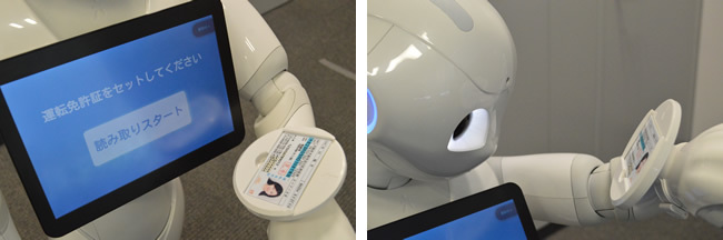 今秋にローンチを予定しているPepper 専用の自動会員登録用アタッチメント。免許証やマイナンバーカードをすばやく読み取り、会員登録や身分証明の効率化に貢献する。「人に見せるのは心配だけど、ロボットなら」というケースも多いらしく、精神的ハードルを下げる効果もあるとのことだ。