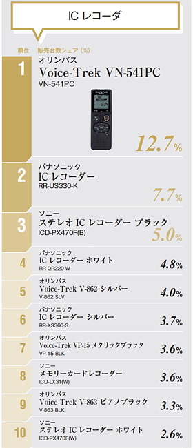2017年8月のピックアップカテゴリは、「デジタル一眼レフカメラ」「ICレコーダー」「Bluetooth対応ヘッドホン」「SIMフリースマートフォン」「ノートPC」「4K液晶テレビ」の6つ。「ICレコーダー」は、オリンパスのシンプルモデル「Voice-Trek VN-541PC」がシェア12.7%を占め、トップでした。ICレコーダー