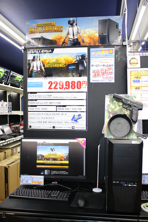 本館は1階、2階、5階が店舗になっており、1階では以前と同じくドスパラのゲーミングPCブランド「ガレリア」を販売。店頭では、日本では初となる、大人気ゲーム「PLAYERUNKNOWN'S BATTLEGROUNDS(PUBG)」の推奨PCを展開している。