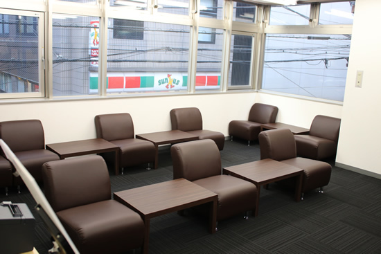 2階では中古品の買取と各種サポートを受け付ける。受付カウンターの前には整理券発行機やイス、テーブルを完備し、くつろぎながら順番を待つことができる。