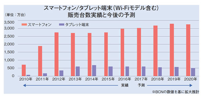 BCNのBCN総研が今年6月に「大胆予測! 2020年のデジタル家電市場」としてまとめた2010年~16年の実績(BCNの数値をもとにした拡大推計)と17年~20年の予測によると、16年から伸びがさらに鈍化したスマートフォンの年間販売台数は19年にピークを迎え、翌20年には微減に転じる見通しだ。