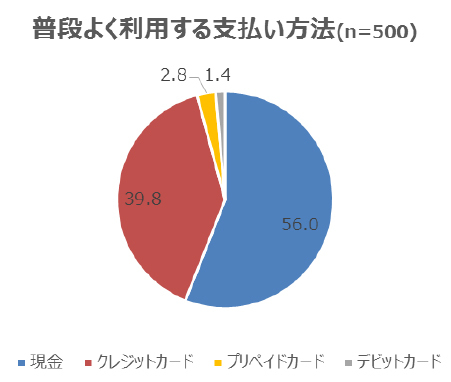 働く男女500名を対象に、普段のお買い物時の支払い方法に関する実態を調べた。支払い方法は「現金」が56.0%と半数以上に達したものの、「クレジットカード」も39.8%を占め、カード払いが約4割まで広がっていることがわかった。