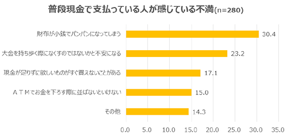 普段、現金で支払っていると回答した280名に対し、不満点をきくと、「財布が小銭でパンパンになる」「大金を持ち歩く際になくすのではないかと不安になる」がともに2割を超え、ATMから月に一度しか現金を引き出さない人が多いことからも、日々、現金の扱いに悩んでいることがうかがえる。