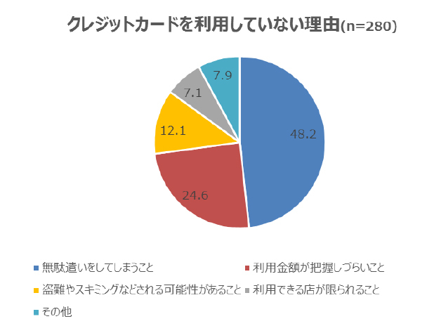 280名の「現金派」がクレジットカードを利用していない理由の1位は、「無駄遣いをしてしまう」、2位は「利用金額が把握しづらい」、3位は「盗難やスキミングなどの可能性がある」だった。