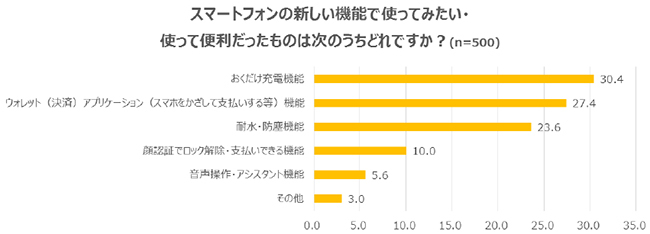 また、質問を変え、回答者全員に、使ってみたいスマートフォンの新機能、使って便利だった機能を聞いたところ、「置くだけ充電(ワイヤレス充電)」や「かざして決済(ウォレットアプリ)」ほど多くないものの、1割が「顔認証でロック解除・支払い」を挙げた。スマホをかざして支払う決済アプリの利用意向率は高く、半数以上の51.8%が「利用したい」と回答。現金よりもスマートな決済方法に、興味がある人が多いことを示している。