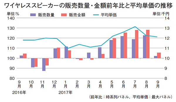 類似のカテゴリとして挙げられるのがワイヤレススピーカー市場。昨年、伸びが止まった感があったが、このところ、JBLのハーマンがシェアを急拡大。シェアトップのソニー、3位のBOSEと競いながら、販売台数増に貢献している。平均単価も上昇傾向だ。
