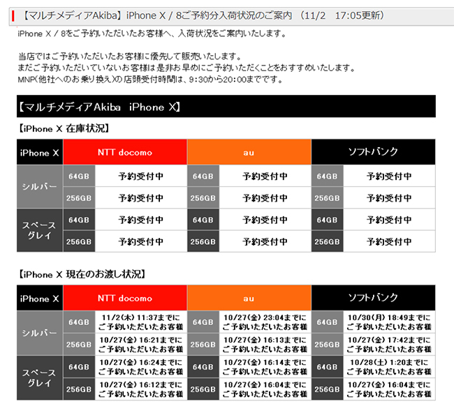 この表を見る限り、マルチメディアAkibaでの発売日受け渡し分について、スペースグレイ(256GB)は受付開始から各キャリアとも数分で完売していたようだが、NTTドコモ用のシルバー(64GB)は発売前日まで受け付けていたことになる。