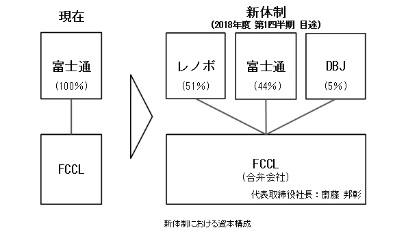 富士通はFCCL株の51%をレノボに、5%を日本政策投資銀行(DBJ)に譲渡する。譲渡価格は合計280億円。合弁会社に対する富士通の出資比率は44%に下がるが、現FCCLの齋藤邦彰代表取締役社長が引き続き、社長を務める。なお、既存のNECと、今回の富士通との合弁事業は独立して運営し、富士通の生産拠点や「FMV」ブランドは今後も継続して活用する。DBJは合弁会社への投資を通じ、同事業の持続的な発展を支援していく。