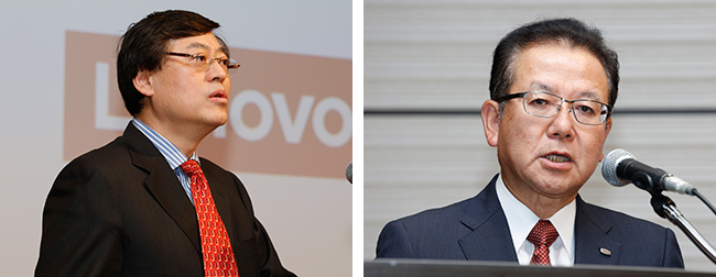 左からレノボ・グループ・リミテッドのヤンチン・ヤン会長兼CEO、富士通の田中達也代表取締役社長