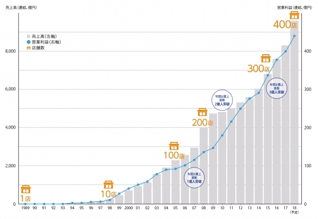 1989年に東京都府中市に1号店をオープンし、首都圏での多店舗化を経て、全国に出店。独自の業態開発やM&A、居抜き物件を活用した出店攻勢によって店舗を拡大し、300店舗を達成した2015年からわずか3年で400店舗の大台に達した。
