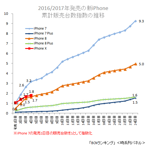 「iPhone Xは当初は2018年に発売予定で、前倒しでリリースした」という裏話も海外の情報サイトから飛び出し、iPhoneファンの間では、多少の不満は目をつぶろうという雰囲気も出てきた。予約絡みのトラブル、分割払い時の与信審査、コア層の高齢化、Android TVでリビングに食い込むGoogle、カメラ機能で独Leicaと組むファーウェイといった競合企業の台頭、最新の「iOS 11」に対応していない人気アプリなど、さまざまな向かい風が吹くなか、従来のデザインを踏襲した「iPhone 8」をわずかに上回る「iPhone X」の初速は、今後の伸びが期待できる、まずまずの滑り出しといえるのではないだろうか。販売データからも、今年のiPhoneは「どれがベストか悩ましいラインアップ」といえそうだ。(BCN・嵯峨野 芙美)