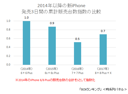 家電量販店の実売データを集計した「BCNランキング」で、「iPhone X」の日ごとの販売台数をみると、発売初日の11月3日は、祝日だったこともあり、過去2年間に発売されたiPhoneのなかで最も多かった。しかし、続く土日は伸びず、発売から3日間の販売台数は、9月22日に先行して発売した「iPhone 8」「iPhone 8 Plus」とあわせても、iPhoneシリーズ国内累計販売台数1位の「iPhone 6」と同時に発売した「iPhone 6 Plus」の合計の7割にとどまった。