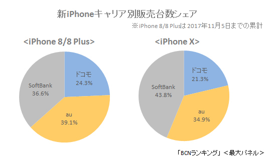 「iPhone X」に限ったキャリア別販売台数シェアは、ドコモ21.3%、au34.9%、ソフトバンク43.8%。「iPhone 8/8 Plus」では、発売後5日間の時点と変わらず、auがトップを保っているが(詳細は<新iPhone、前年を下回る低調なスタート、キャリア別ではauが4割占める>を参照)、「iPhone X」は、iPhoneを独占販売していた期間の長いソフトバンクがauを抑え、トップに立っている。