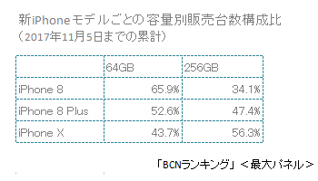 ストレージ容量の人気は、意外にも拮抗しており、256GBが56.3%、64GBが43.7%だった。11月5日までの累計で「iPhone 8/8 Plus」と比べると、若干、「iPhone X」のほうが256GBの割合が高い。
