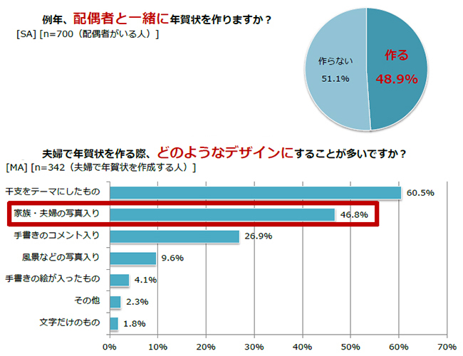 配偶者がいる700人のうち、48.9%が例年、配偶者と一緒に年賀状を作成すると回答し、その7割が「夫婦のよいコミュニケーションになる」と認識している。デザインは「干支をテーマにしたもの」(60.5%)、「夫婦・家族の写真入り」(46.8%)が上位だった。