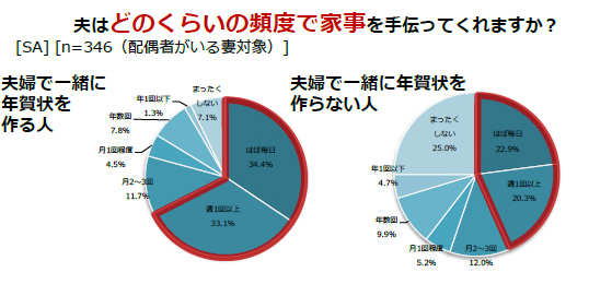 また、年賀状を一緒に作る夫婦ほど夫が家事に積極的とも判明。一緒に作る夫婦の妻は、「ほぼ毎日」を含め、67.5%が「週1回以上、夫が家事を手伝う」と答えたが、一緒に作らない夫婦は43.2%にとどまった。夫が家事をまったくしない割合も、一緒に作る夫婦は7.1%、一緒に作らない夫婦は25.0%と、かなりの差が出る結果となった。