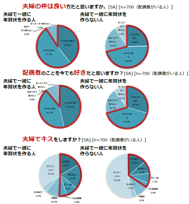 残りの51.1%は、配偶者と一緒に年賀状を作成しないと回答したが、夫婦の関係をたずねる「夫婦の仲は良いほうだと思うか」「配偶者を今でも好きか」「月1回以上夫婦でキスをするか」という質問に、「とてもそう思う」「ややそう思う」と答えた割合は、年賀状を一緒に作る/作らない夫婦で10ポイント以上の差があった。特に、夫婦の仲のよさは、一緒に作る夫婦は90.9%が「そう思う」と回答したのに対し、一緒に作らない夫婦は71.2%と、19.7ポイントも低かった。この調査結果から、「年賀状を一緒に作る夫婦ほど仲がいい」といえるだろう。