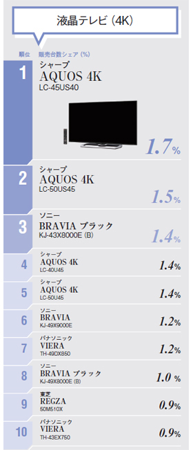 2017年9月のピックアップカテゴリは、「スマートフォン」「SIMフリースマートフォン」「ノートPC」「携帯オーディオプレーヤー」「4K液晶テレビ」「有機ELテレビ」の6つ。「4K液晶テレビ」の1位・2位はシャープの「AQUOS 4K」のUSラインの45型「LC-45US40」、50型「LC-50US40」でした。後継機種が発売済みのソニーの「BRAVIA」の43型「KJ-43X8000E(B)」が3位に浮上しています。