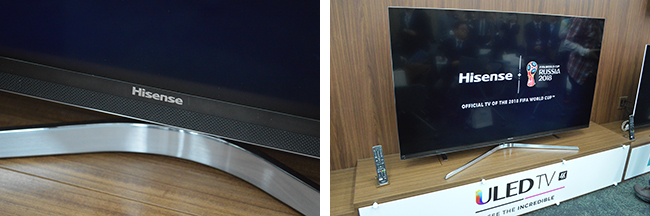 画面の下部にフロントスピーカーを搭載。起動時にはハイセンスとワールドカップのロゴを表示
