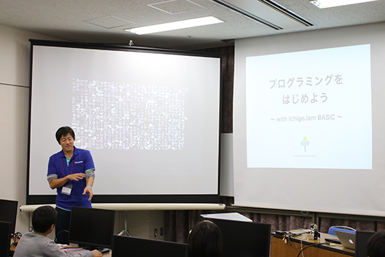 今回の教室で指導したのは、プログラミングクラブネットワーク(PCN)の松田優一氏で、参加者にプログラミング作業をわかりやすく解説した。