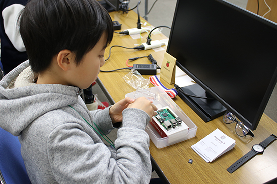 教室は作業環境を整えるところから始まった。基盤がむき出しになっているPCをケースに入れ、HDMIでPCとディスプレイをつなぎ、microSDを挿し込み、キーボードと接続して、電源を入ると、子どもからは「できた!」と大きな声があがった。