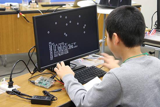 最終課題は、下から上に流れる障害物を避けながら、進んだ距離を競い合う「川下りゲーム」。プログラムを組む際には、あえて「操作ができない」や「終わりがない」などの不具合が発生するようにソースコードを書くように指示。不具合に気が付いた子どもが指摘すると、一つひとつ解決していき、最後には完成させた。