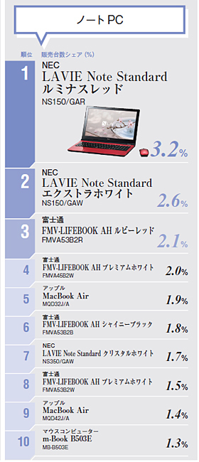 2017年9月のピックアップカテゴリは、「スマートフォン」「SIMフリースマートフォン」「ノートPC」「携帯オーディオプレーヤー」「4K液晶テレビ」「有機ELテレビ」の6つ。「ノートPC」の1位は、7月、8月に続き、「LAVIE Note Standard」シリーズの「NS150/GAR」のルミナスレッドが獲得。2位は同製品のエクストラホワイトでした。