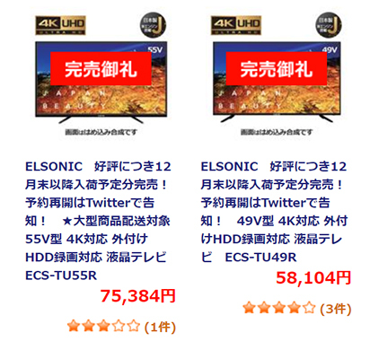 流通の格安4Kテレビはノジマにも波及した。11月上旬発売予定だった「ELSONIC(エルソニック)」というPBで55型「ECS-TU55R」(税別6万9800円)、49型「ECS-TU49R」(5万3800円)が、10月7日の予約開始が数日で受付終了した。その後も「12月末以降入荷予定分」としていたものが、既に完売している。