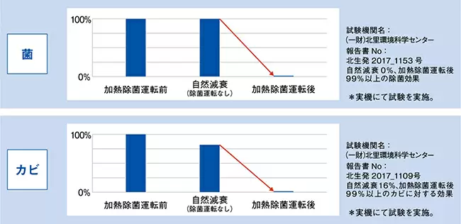 「加熱除菌」は、その処理を施した後に熱交換器を55℃で10分間加熱することで、残留した水分に付着した雑菌を除菌するだけでなく、カビ菌の除去までするのだ。