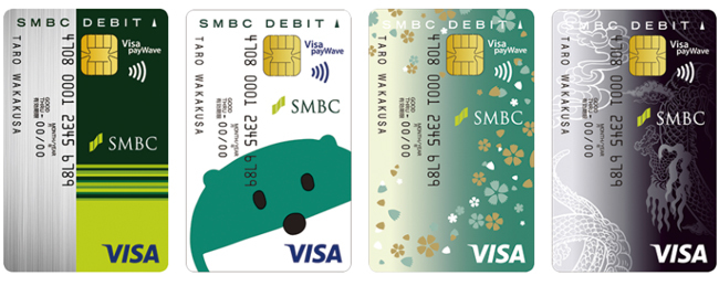 タッチ機能付きSMBCデビット(左から、ベーシック、ミドすけ、和柄1:なでしこ、和柄2:龍)
