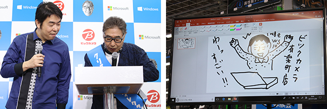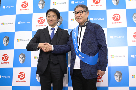 ビックカメラ執行役員の佐藤壮史店長は「MRは話題性があり、集客効果を期待している。当社では「ラクウル」やサポートカウンターでPCの買取施策、クーポンでの買い替え喚起を進めているので、PC需要は高まりそうだ」とコメントした。また、就任披露式では、蛭子能収さんが制作したPOPがビックカメラ有楽町店に納品された。