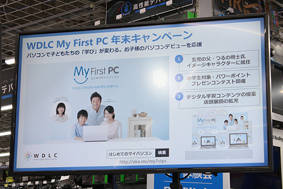 そして4つめが、日本マイクロソフトも理事企業として参加する「ウィンドウズ デジタルライフスタイル コンソーシアム(WDLC)」が推進する「My First PC」だ。「初めてのマイパソコン」に最適な商品を店頭で紹介するほか、デジタル学習コンテンツの提案なども展開。今回からは新たに、五児の父であるタレントのつるの剛士さんをイメージキャラクターに起用し、子どものPCデビューを応援する。